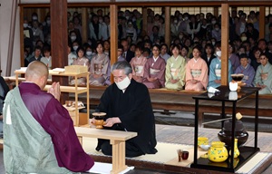 本茶会は、喫茶の風習を日本に伝えた臨済宗の開祖・栄西の遺徳をしのぶもので、献茶式では栄西禅師をまつる祭壇に茶がささげられるなど、厳かな儀礼が執り行われ、多くの来場者が訪れました。